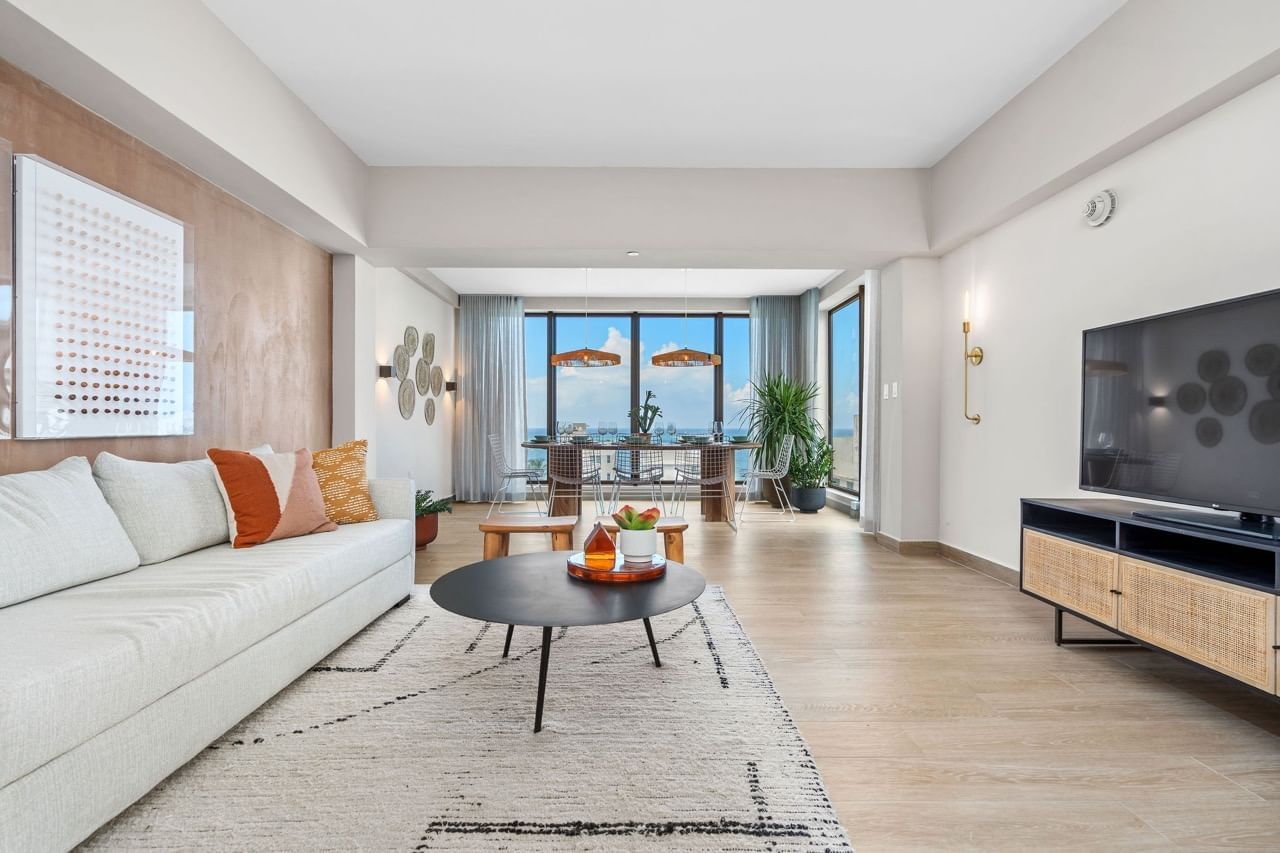 Experience luxury living in our three-bedroom penthouse featuring 3 king beds, a spacious living room with sofa bed, large dining table, kitchenette, and a private outdoor terrace with stunning city and ocean views, complete with a private jacuzzi and day bed.
